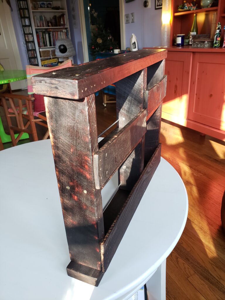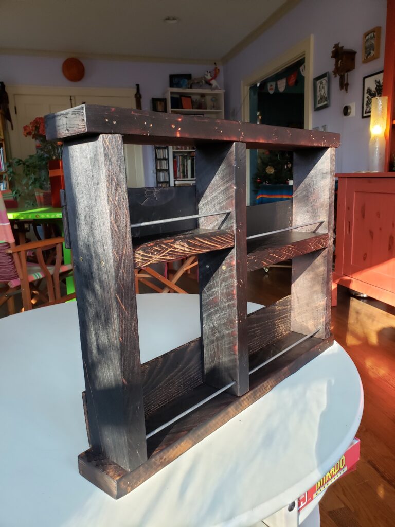 (2020) – I created this rack using pallet wood collected from my workplace and burning the wood/oiling it using the Japanese method of “Shou Sugi Ban”. The metal bars were re-purposed from old wooden wire spools which were also acquired from my workplace.