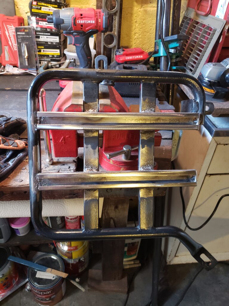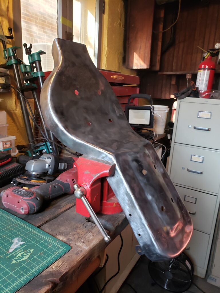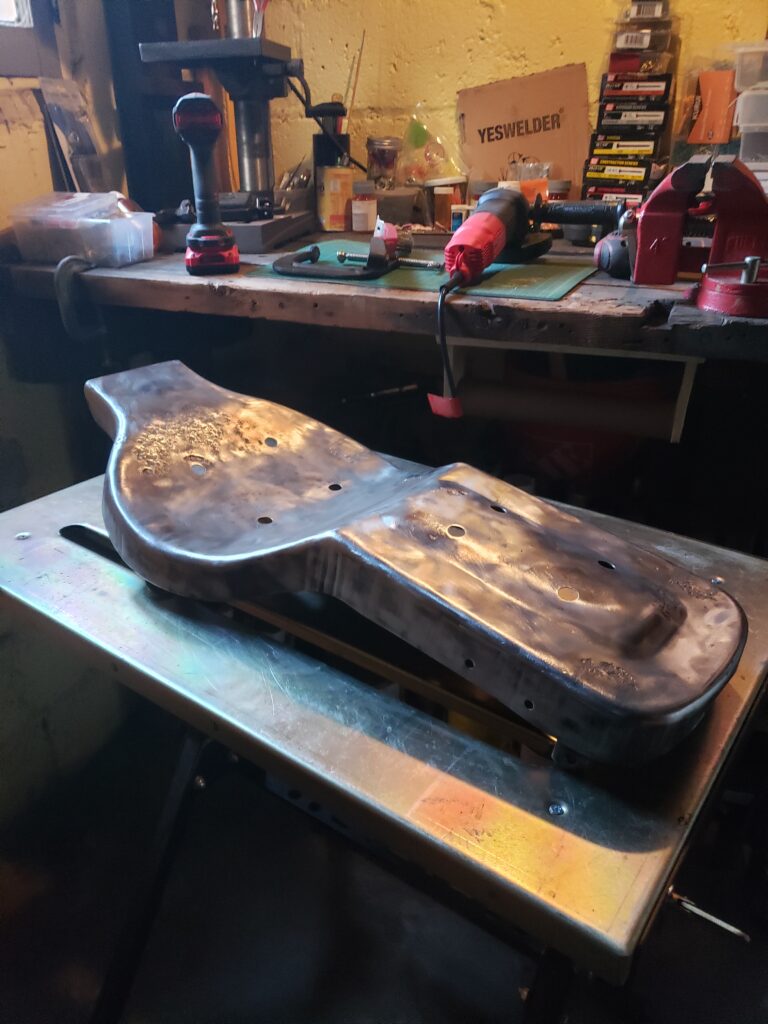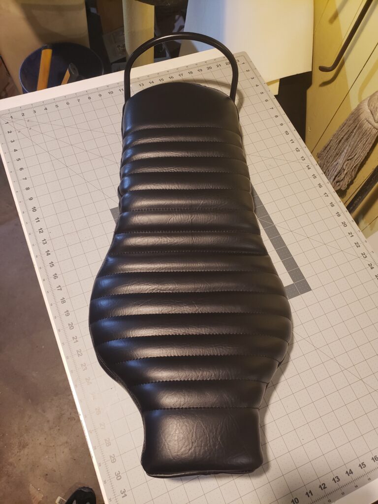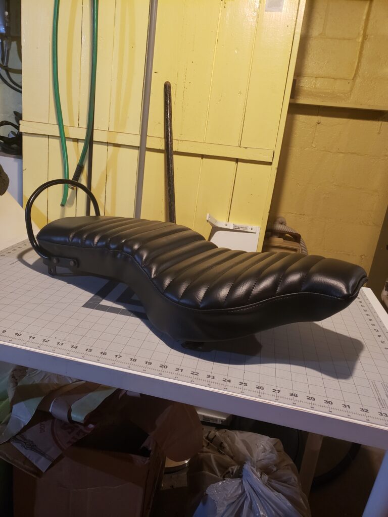 (2024) – After purchasing a sad looking motorcycle seat on ebay, I gave it a custom makeover. First I started by removing the old vinyl and rust on the seat pan. Once cleaned up, a fresh coat of rust resistant paint was added to the clean metal surface. Then I shaved the foam to lower the overall seat height for extra comfort, created custom patterns and used artic vinyl to create a custom pleated seat using a 1940’s Singer 111w155 upholstery sewing machine. Finally, I used a rivet gun and carpet spike strips to attach the upholstery to the underside of the seat.