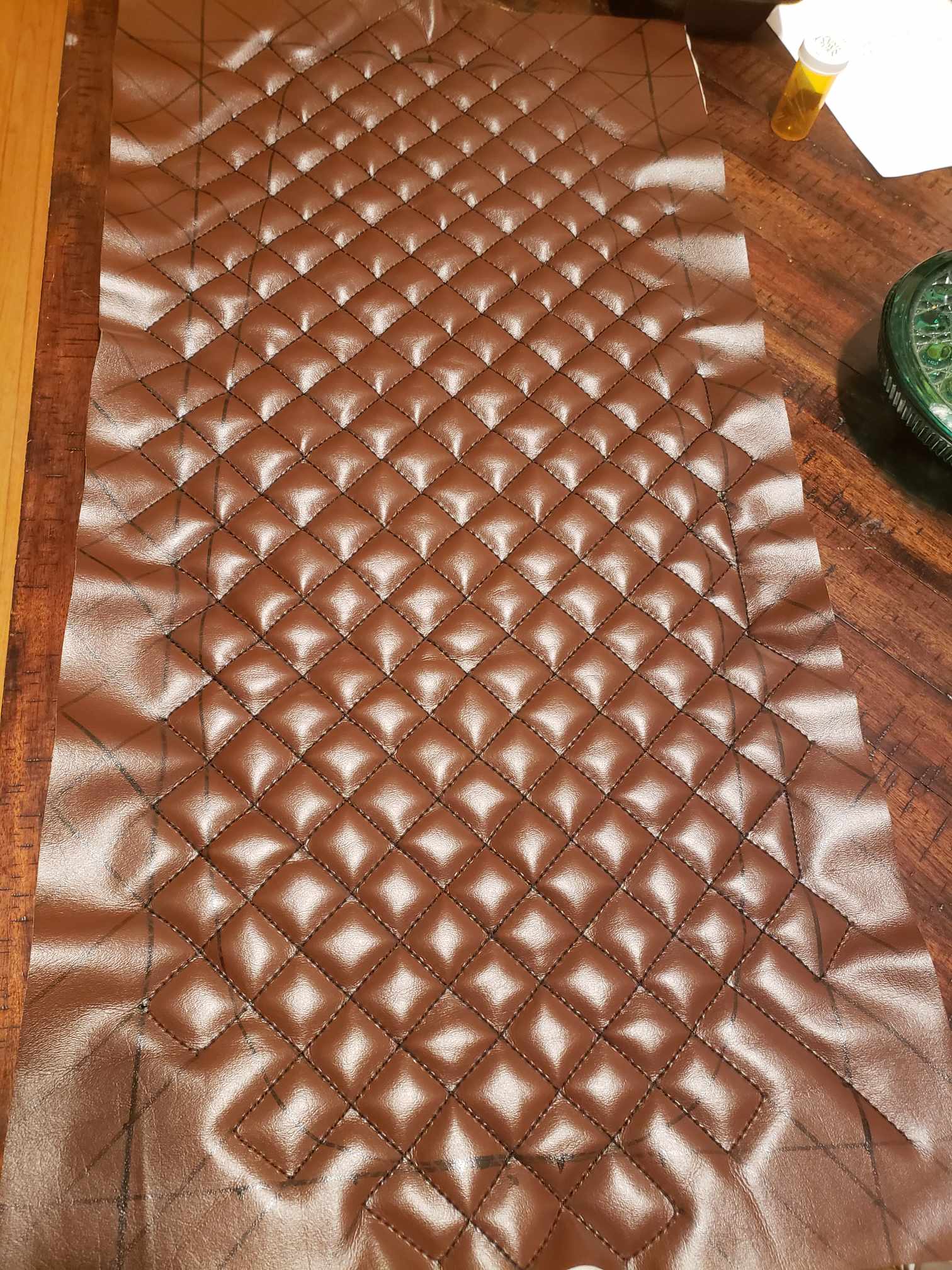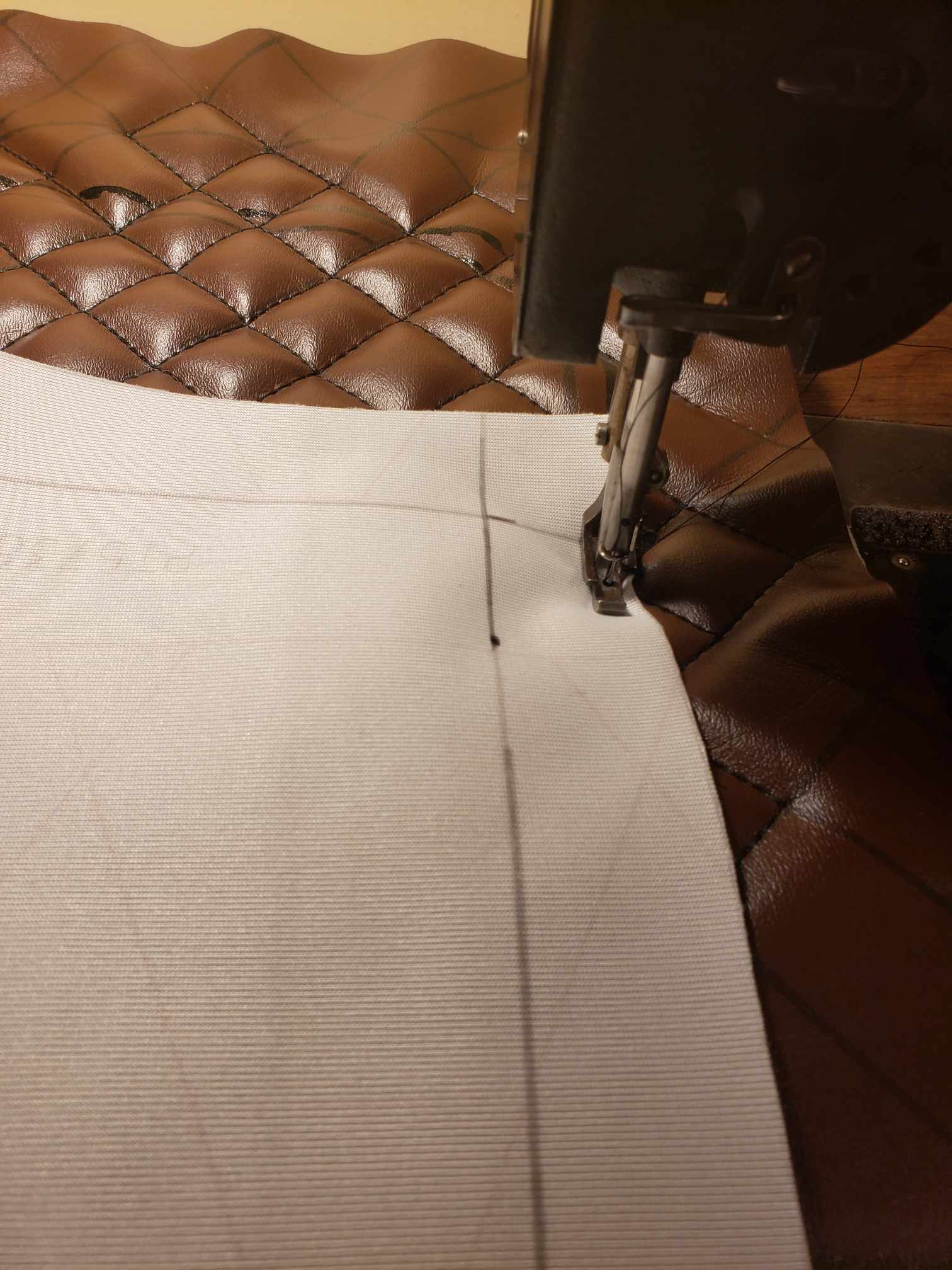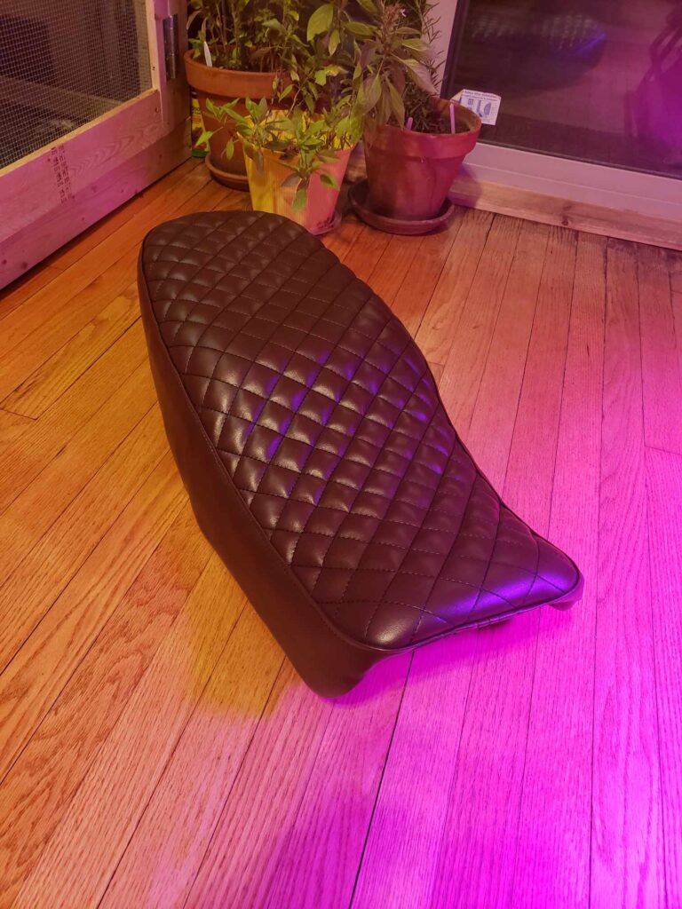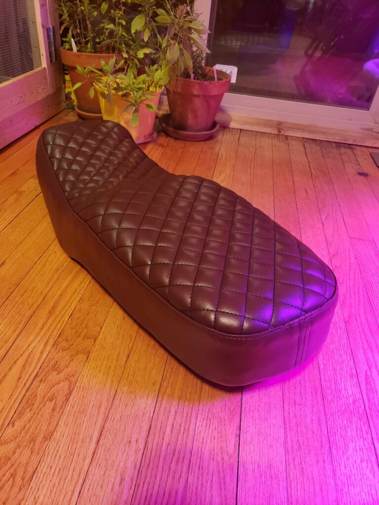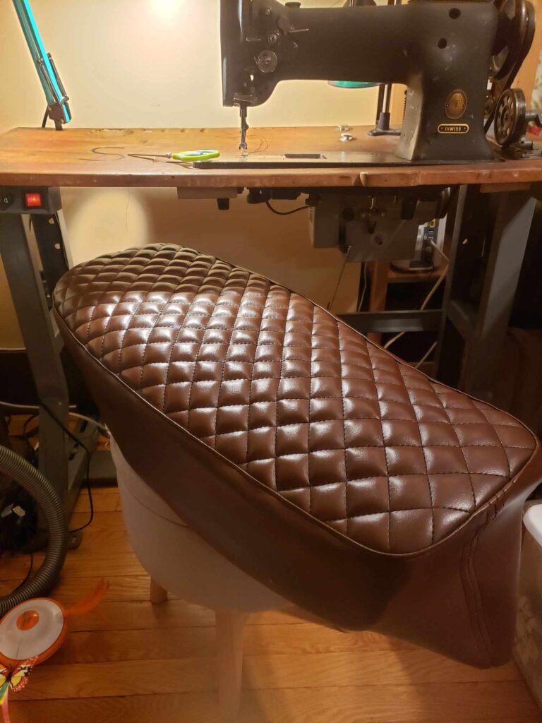 (2025) – After having fun creating my first custom motorcycle seat, I decided to create a second one with a different style in mind. The process was very similar to the first one I created (Which can be viewed lower on this page). The old vinyl was cut off the seat and the interior foam shaved down to a desired form. Then I created a custom pattern for the new seat cover and used a brown marine vinyl. All the sewing was done by hand and on my Singer 111w155.